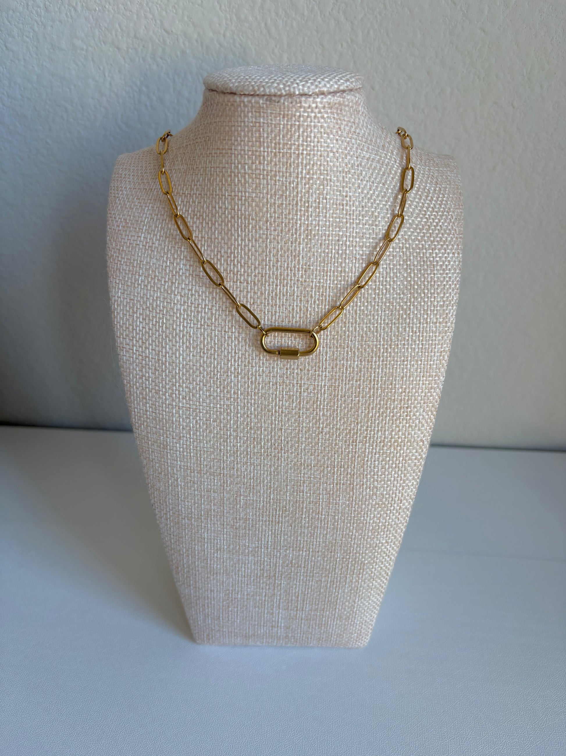 This simple statement features a carabiner clasp with an 18” Paperclip chain. Waterproof, tarnish-proof, and hypoallergenic for everyday wear.